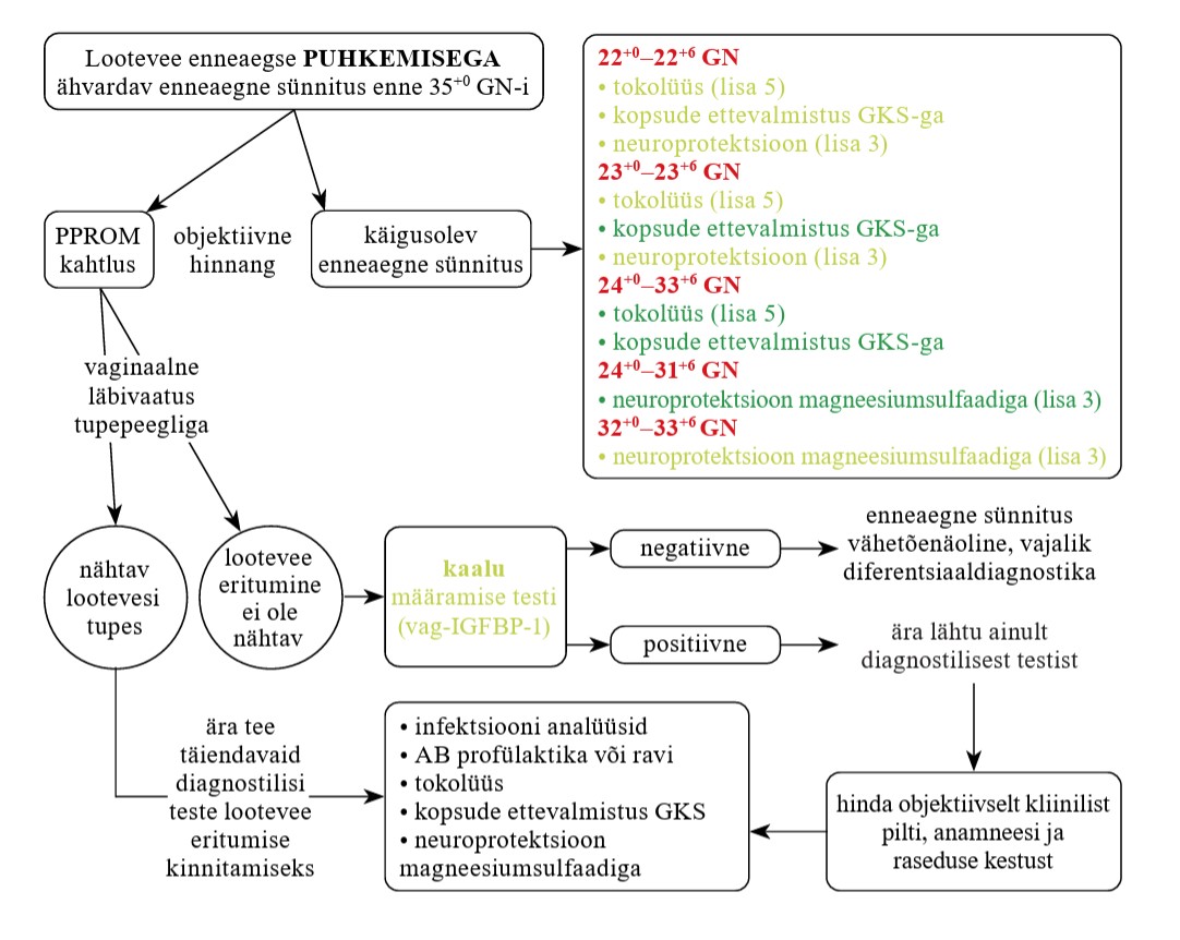 | PPROM | lootevee puhkemine ajavahemikul 22+0–36+6 rasedusnädalat, ingl preterm premature rupture of membranes |